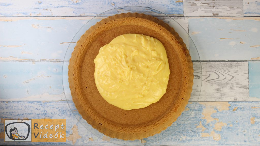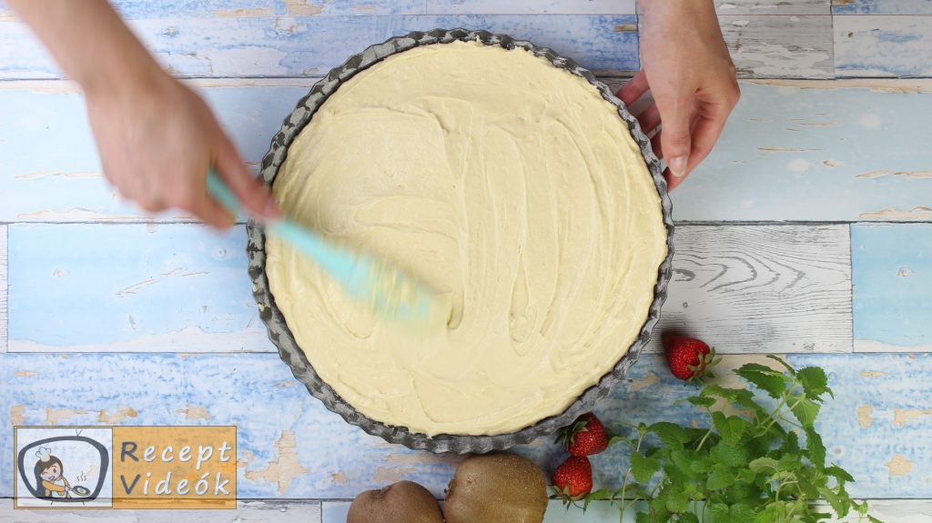 Amikor kész a tészta is, egyenletesen ráöntjük a tetejére a krémet, és a gyümölcsszeletekkel díszítjük.