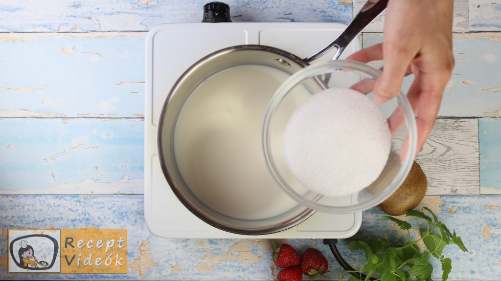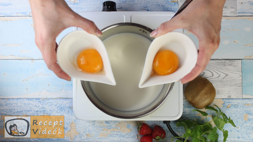 Amíg a tészta sül, a tejet feltesszük forralni, közben hozzáadjuk a cukrot, a tojásokat egyenként és amikor forr, beleszórjuk a pudingport is. Ha kész, hagyjuk kihűlni.